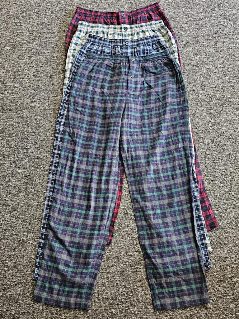 Men's soft, pure cotton flannel pajama pants in classic plaids, with an elastic/tie waist, button fly and two side-seam pockets.